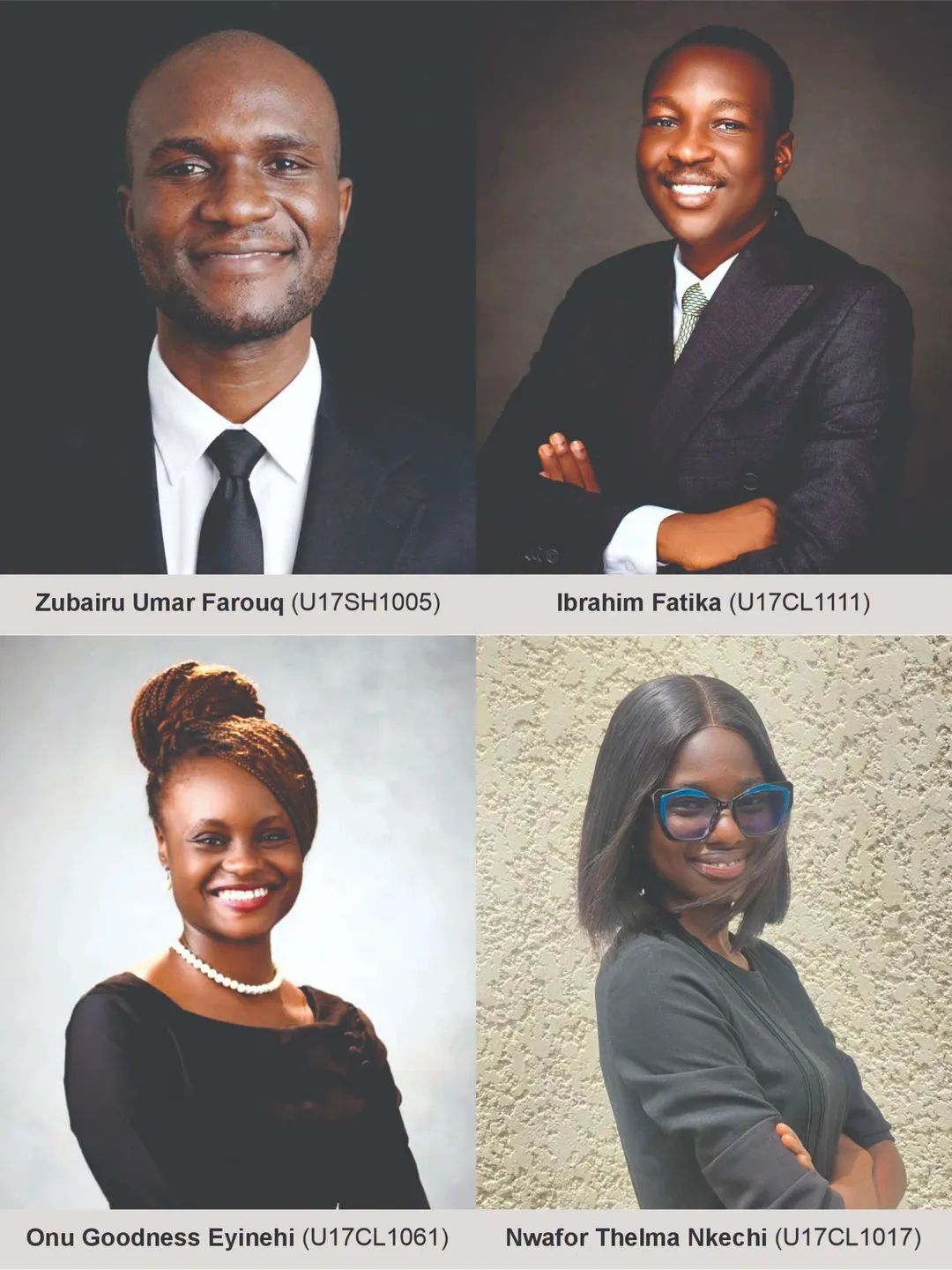The graduates are Onu Goodness Eyinehi, Zubairu Umar Farouq, Nwafor Thelma Nkechi, and Ibrahim Fatika.